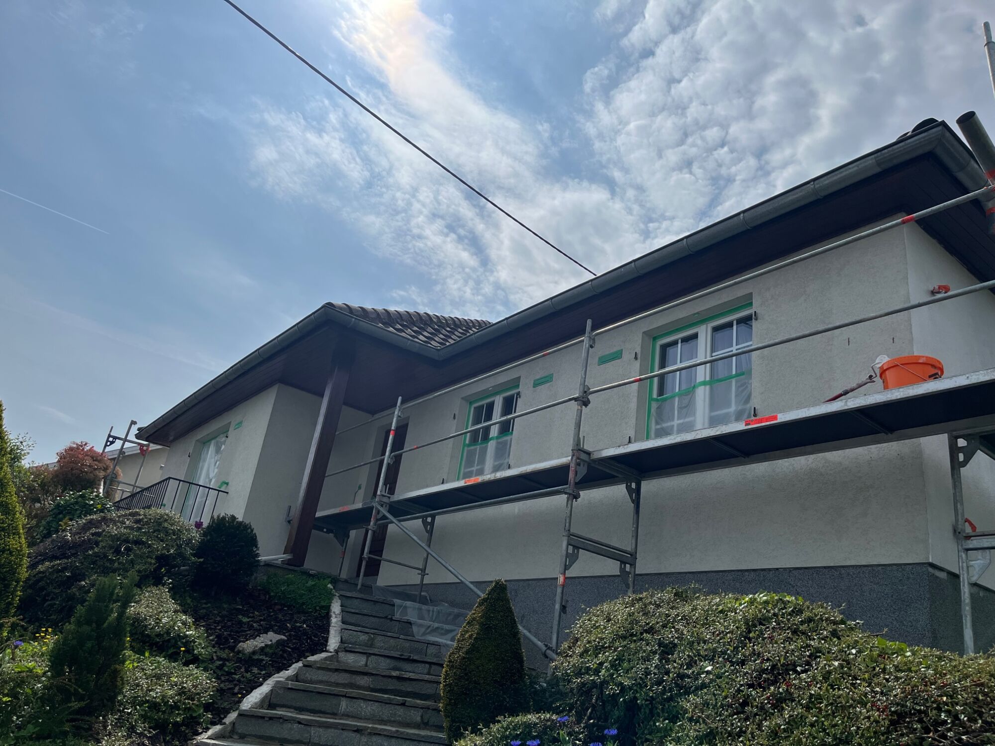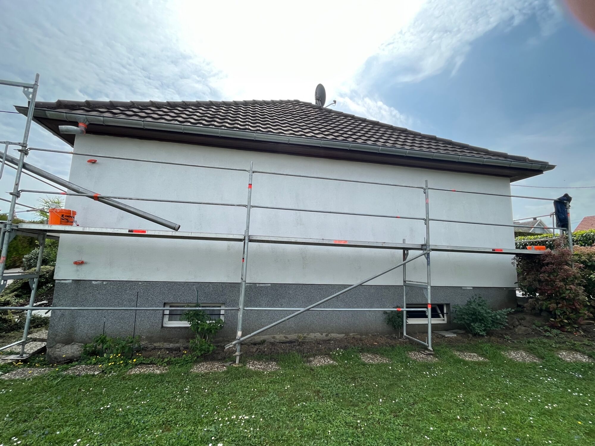 Nous avons d’abord posé l’échafaudage tout autour de la maison pour sécuriser, puis nous avons lavé la façade avec un karcher haute pression.
